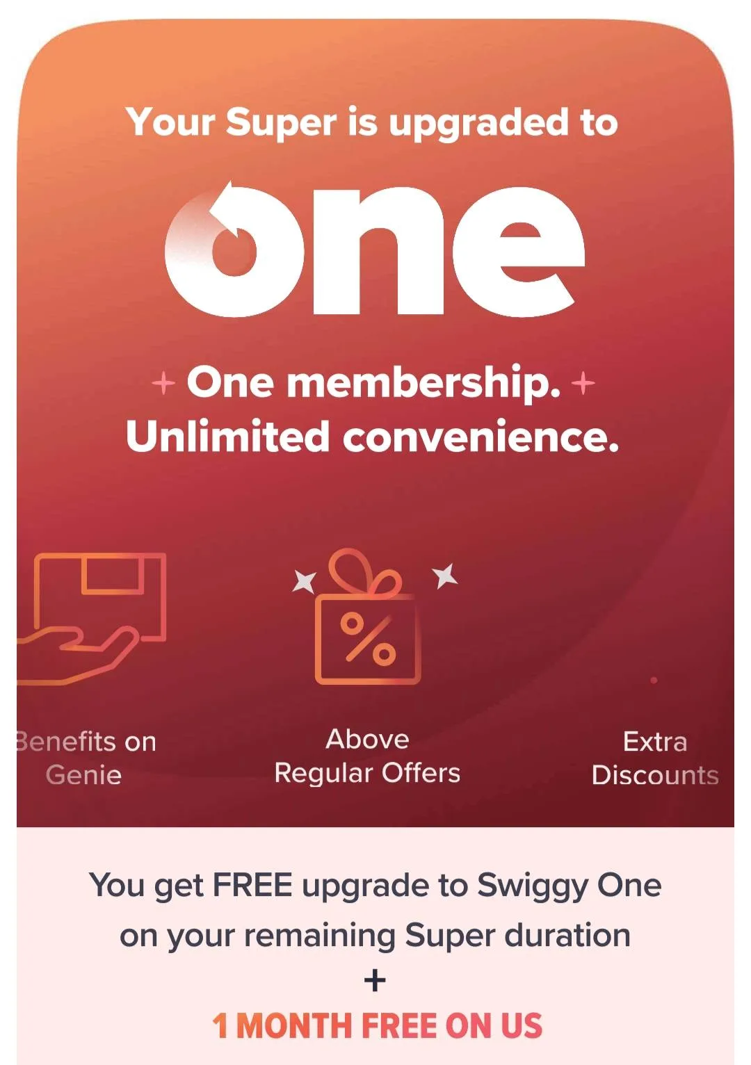 All of the existing Swiggy SUPER members will automatically be upgraded to Swiggy One program for the remaining period of subscription. Also, if you had one plan expiring, you get one month free of Swiggy One membership.