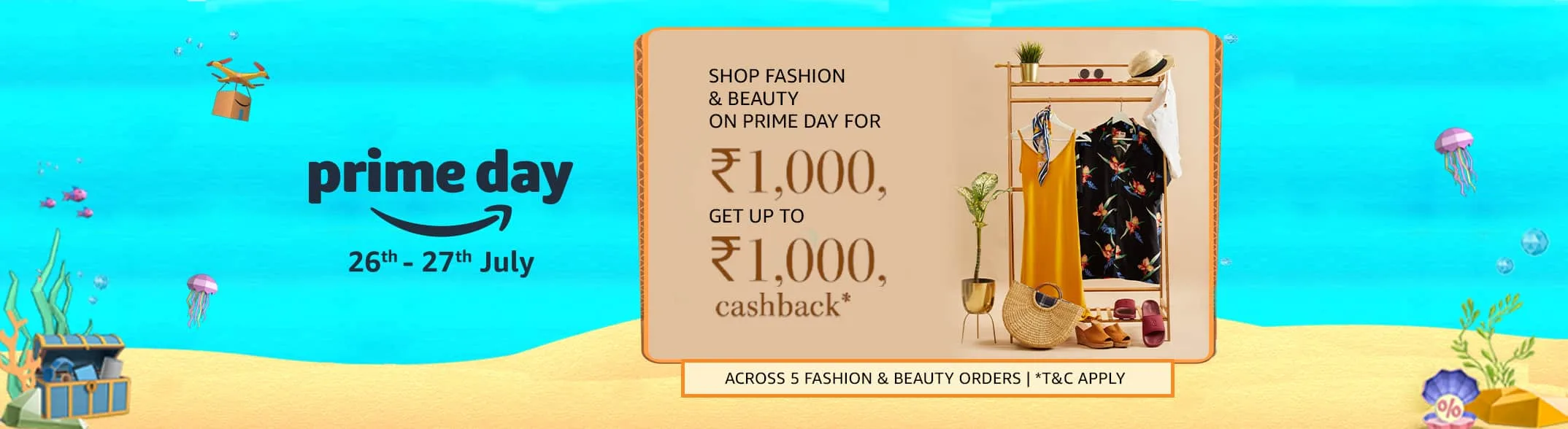Having availed of this coupon for free, you can shop Amazon Fashion products from 26th July and shopping Rs. 1000 and more products will give you a chance to up to Rs. 1000 back. At first, you will get Rs. 200 back on Amazon Prime Day, then get Rs. 800 back on your next four Amazon Fashion & Beauty orders.