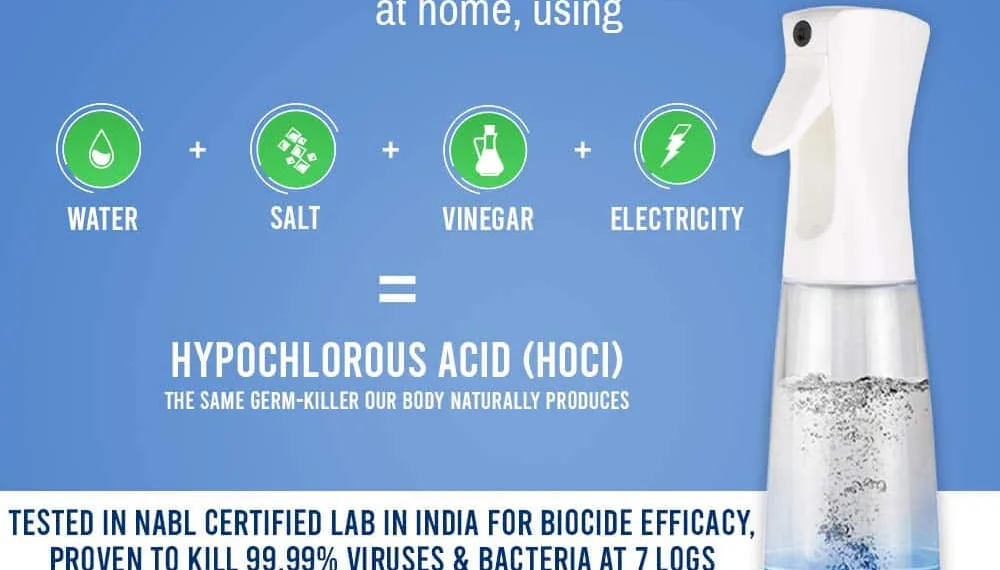 A 300 ml Multi-Purpose HOCI generator, ideal for household disinfection, cleaning and sanitization of hard & non-porous surfaces at home, such as floor, walls, bathroom, furniture, household appliances, kitchen spaces, tableware, bathroom, electronic gadgets, personal care products, cars and much more. Use AQUOX 300ml DG as a Hand Sanitizer, Deodorizer and air purifier to remove bad odour from bathrooms, cars, pet smell etc. Priced at Rs. 3999/- on amazon, this elegantly designed generator is built with an Ultra smooth spray nozzle that triggers uninterrupted spray with fine mist effect, allowing disinfection of larger areas quickly and easily. Features LED light display and one-button switch for easy operation, making it an ideal option for homes or small area disinfection and sanitization purposes.
