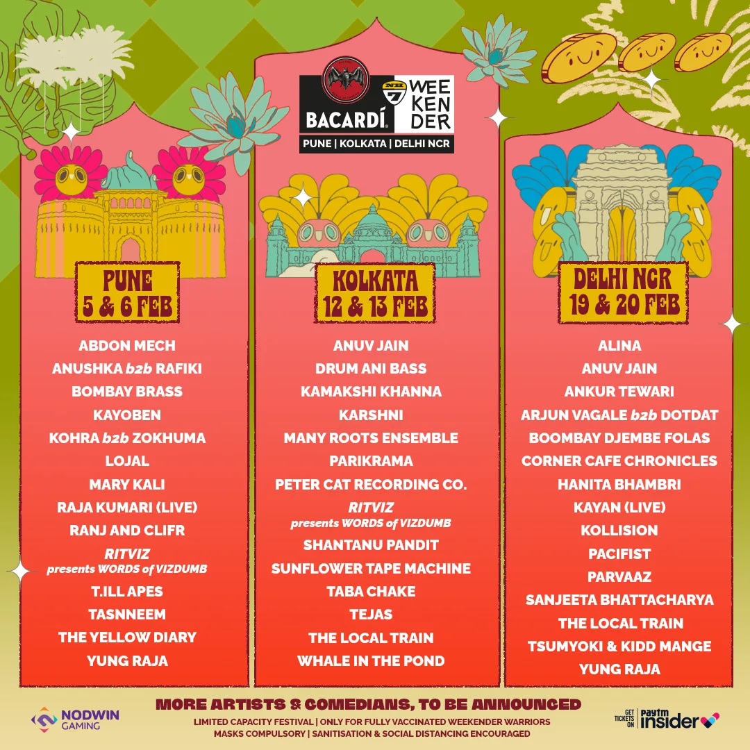 The festival will kick off in Pune with artists like Anuv Jain, Bombay Brass, Raja Kumari, The Yellow Diary, and Ritviz, to name a few, who will take the stage on February 5 & 6, 2022. The festival then travels to Kolkata – ‘The City of Joy’ on February 12 & 13, 2022, with another stellar lineup of artists that includes Peter Cat Recording Co., Karshini, Kamakshi Khanna, Taba Chake and Tejas. BACARDÍ NH7 Weekender wraps up in Delhi NCR giving fans a chance to enjoy electrifying performances by Ankur Tiwari, Kayan, Kamakshi Khanna, Arjun Vagale & Hanita Bhambri amongst others. The audience in Pune, Delhi and Kolkata will be privy to some never seen before performances by artists created specially for the BACARDÍ NH7 Weekender.