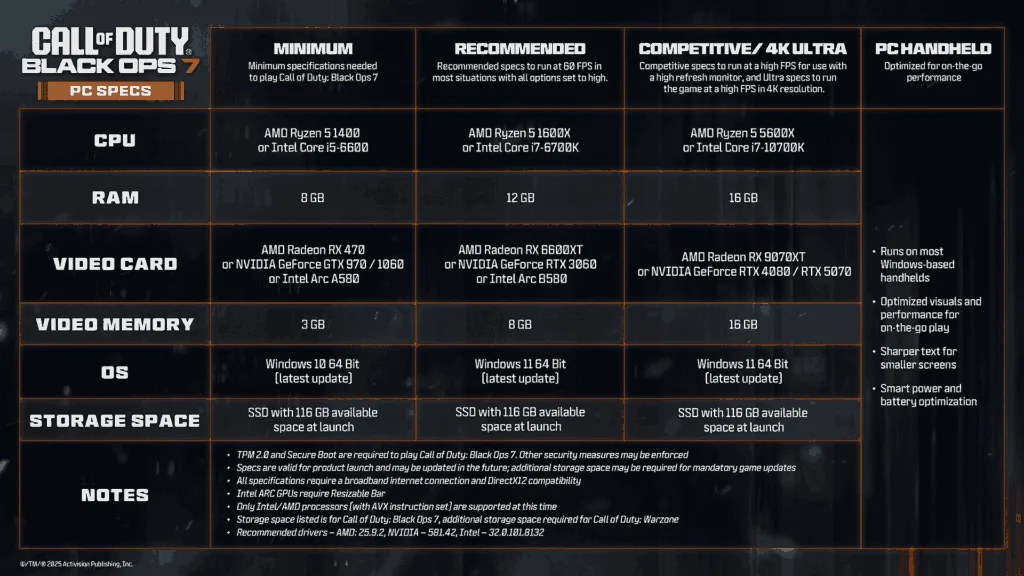 Call of Duty: Black Ops 7 drops November 14 with massive PC upgrades. Activision just revealed full system requirements, preloading details, and confirmed handheld gaming support—including the ROG Xbox Ally. With over 800 customization options and ultrawide monitor support, PC gamers are getting the ultimate experience.