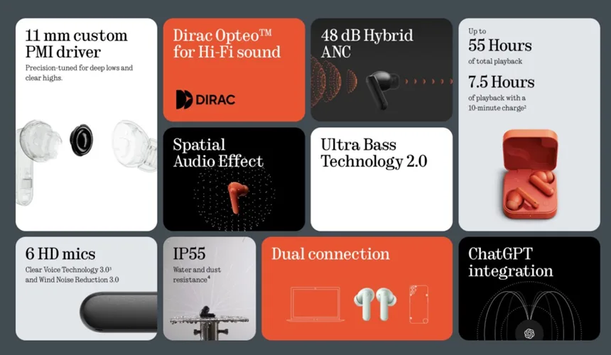 The CMF Buds 2 offer hybrid ANC, ChatGPT integration, and up to 55 hours of playback.