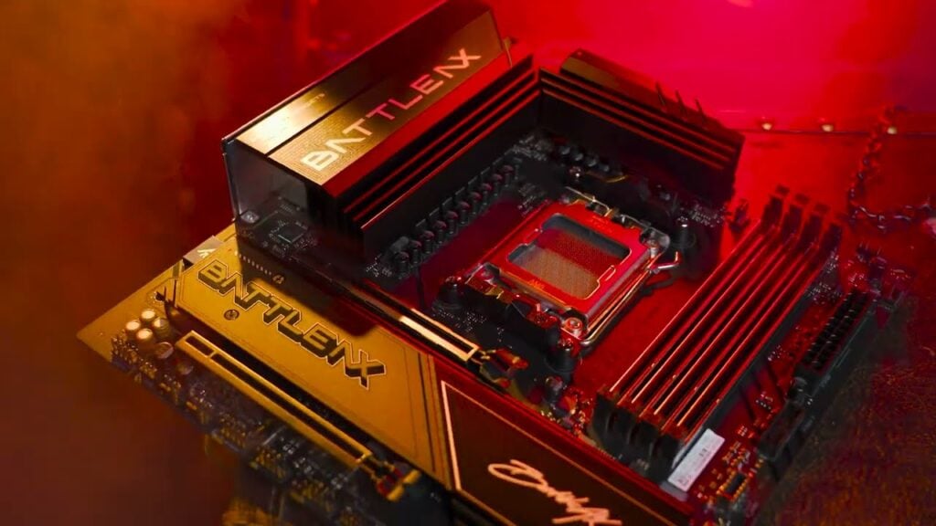 The Battle-Ax introduces refreshed black heatsink armor emphasizing sharp lines and robust metallic texture. It easily handles high-performance CPUs including the Ryzen 9 9900X3D while delivering 5G LAN plus Wi-Fi 7 connectivity for competitive gaming.