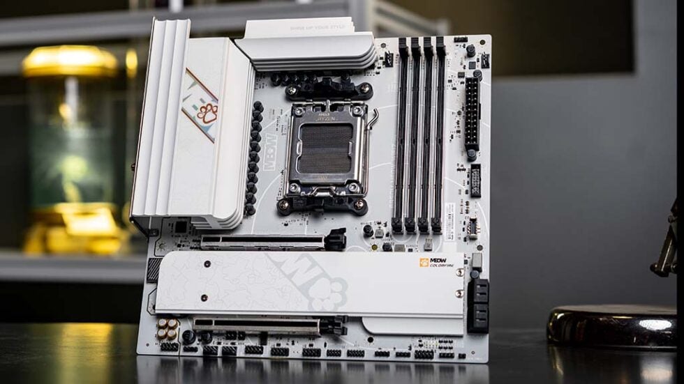 Here’s where things get fun. The MEOW board brings a warm white painted heatsink armor with an iridescent nameplate and even includes a custom MEOW-themed BIOS. Don’t let the playful aesthetics fool you—this board packs serious specs with 5G LAN, Wi-Fi 7, and PCIe 5.0 support.