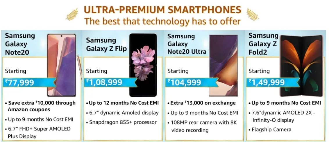 Let’s take a look at the list of Ultra Premium Samsung Smartphones which Amazon is bringing in the Great Indian Festival: