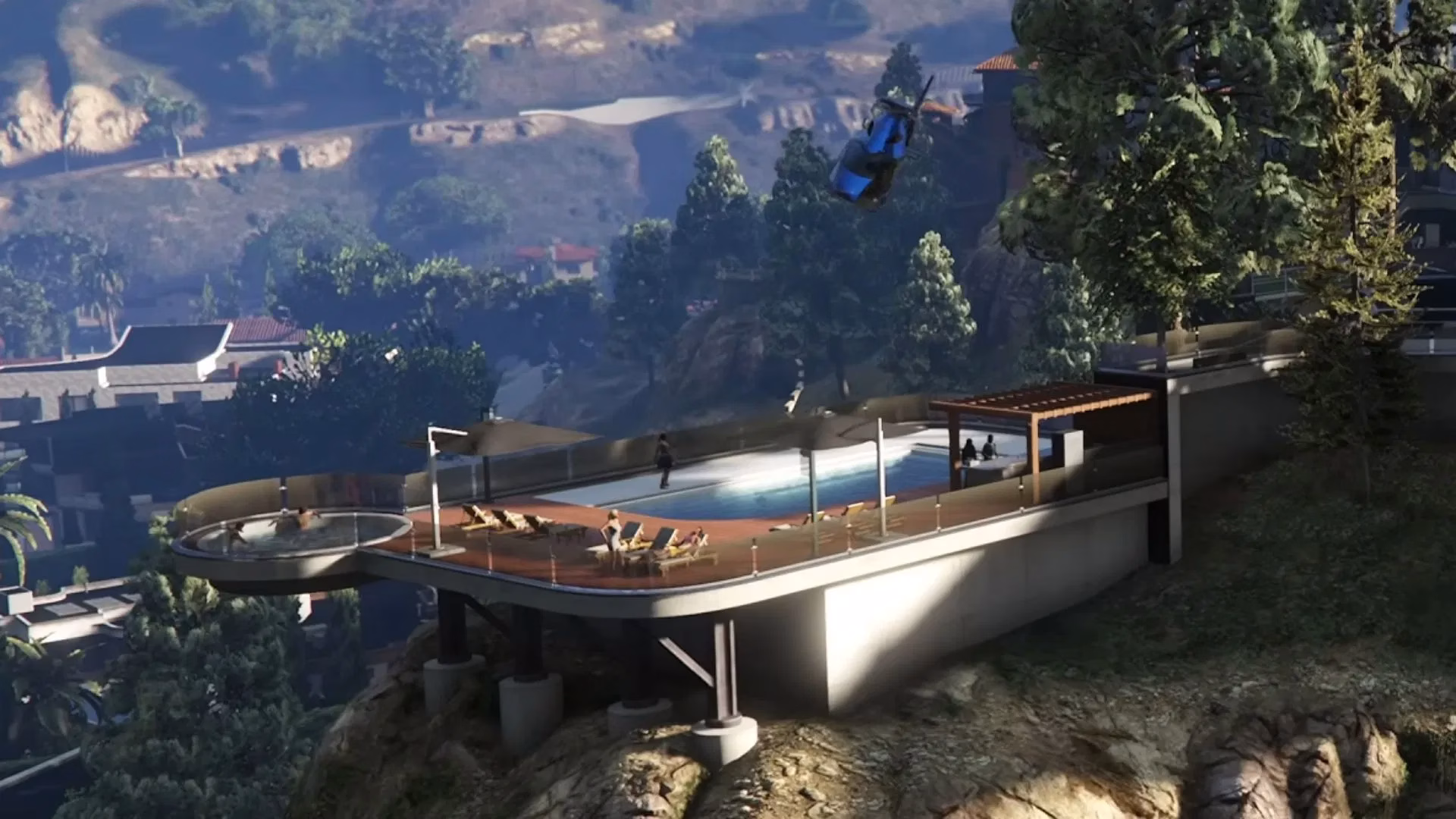 Beyond AI assistants, mansions include pools, yoga spaces, gyms, hot tubs, helipads, arcades, armories, vehicle podiums, and workshops. Players can host mansion parties, hire security teams, and access master control terminals managing multiple businesses from one location.
