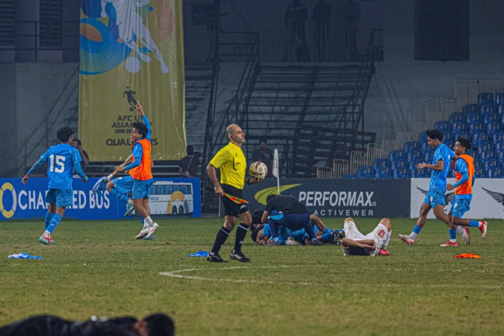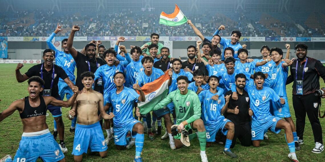 The full-time whistle had barely left the referee’s lips when the India U17 dugout emptied in a surge of euphoria. Players sprinted across the pitch, substitutes and staff joining those who had fought for every inch in the Ahmedabad evening. There were tears, embraces, and fists raised to the sky as the young Indian side celebrated what looked, for long stretches of the match, almost impossible to achieve.