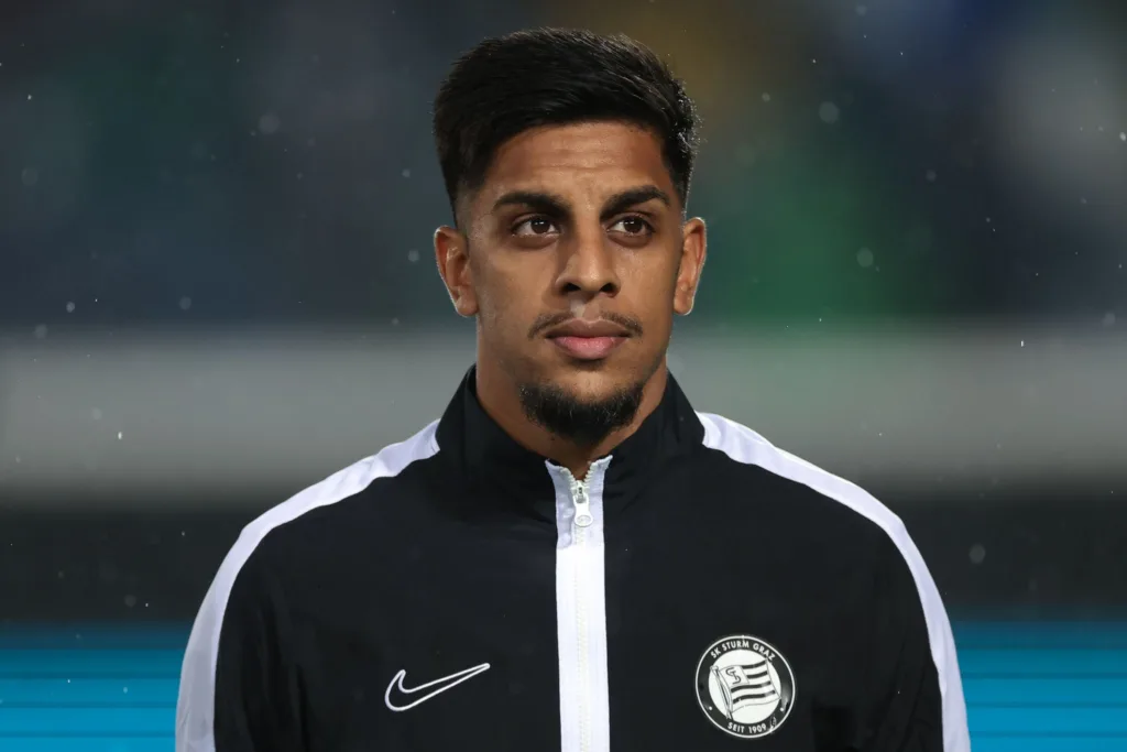 BERGAMO, ITALY – NOVEMBER 09: Manprit Sarkaria of SK Sturm Graz looks on during the line up prior to kick off in the UEFA Europa League match between Atalanta BC and SK Sturm Graz at Stadio di Bergamo on November 09, 2023 in Bergamo, Italy. (Photo by Jonathan Moscrop/Getty Images)