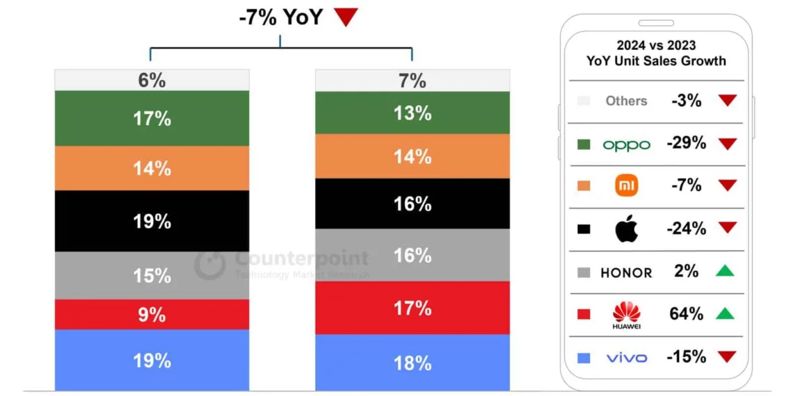 Various factors contributed to Apple’s iPhone struggles during this period as mentioned by Counterpoint analysts. Senior Analyst Mengmeng Zhang pointed out competition at the end from Huawei’s resurgence and pricing pressures from rivals like OPPO, Vivo, and Xiaomi in the mid-range segment. Despite the quality of the iPhone 15 its lack of upgrades compared to models caused consumers to stick with their older iPhones.