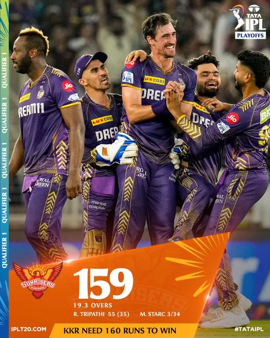 SRH’s batting line up faltered against KKR’s disciplined bowling. Despite Tripathi’s efforts and a brief cameo from Pat Cummins, who scored a brisk 30, SRH managed only 159 runs in 19.3 overs. The lack of substantial contributions from other batters and early setbacks proved costly for SRH.