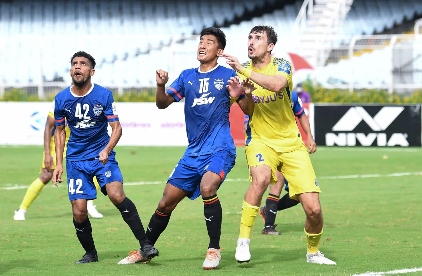 The deadlock was broken in the 45th minute when Bengaluru FC’s Namgyal Bhutia took a superb free-kick that found the back of the net, leaving Kerala Blasters’ keeper Albino Gomes with no chance.