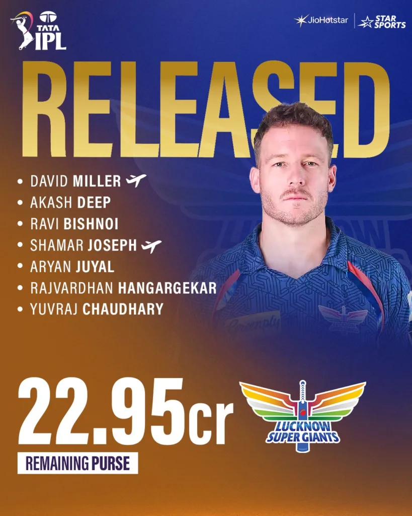 Beyond the headline departures of Bishnoi and Miller, LSG released six additional players to optimize squad composition and create auction flexibility.