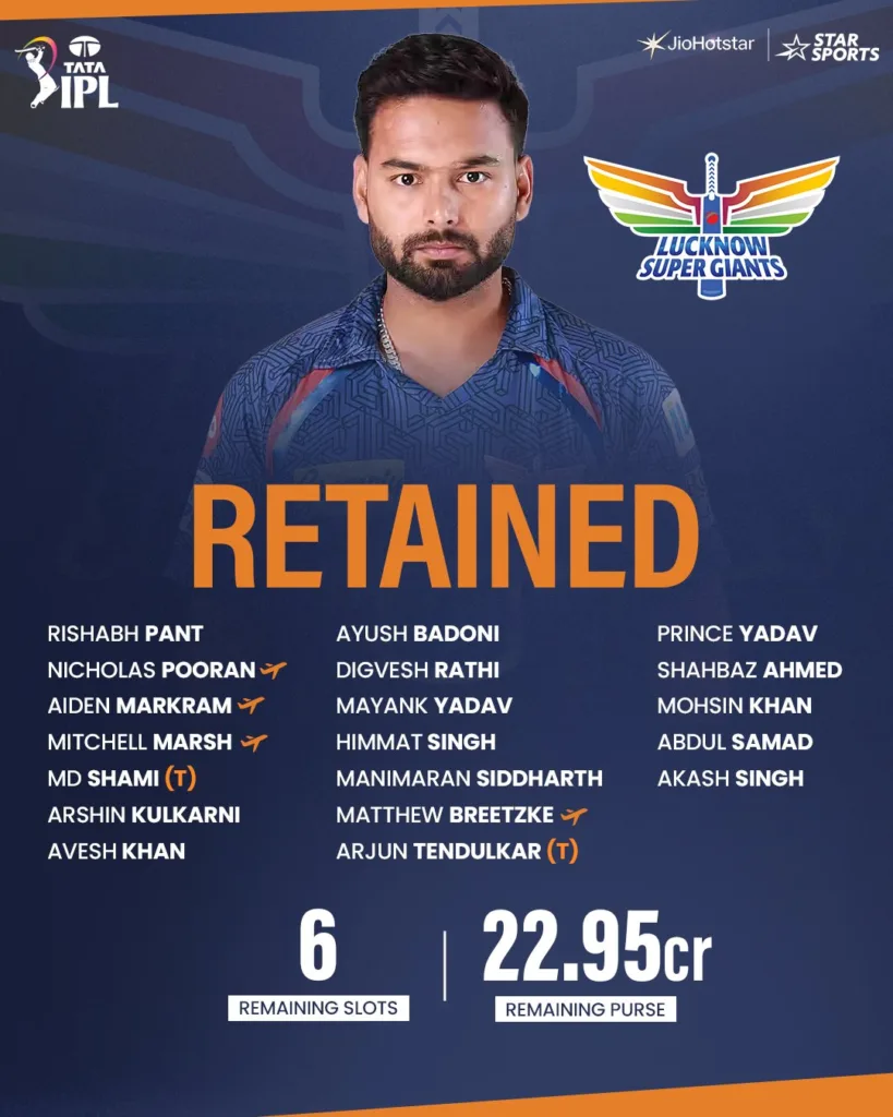 Lucknow Super Giants retained 17 players from their IPL 2025 squad, including captain Rishabh Pant, Nicholas Pooran, Mitchell Marsh, Aiden Markram, Mayank Yadav, and Avesh Khan. They also acquired Mohammed Shami and Arjun Tendulkar through trades, bringing their total squad to 19 players ahead of the auction.