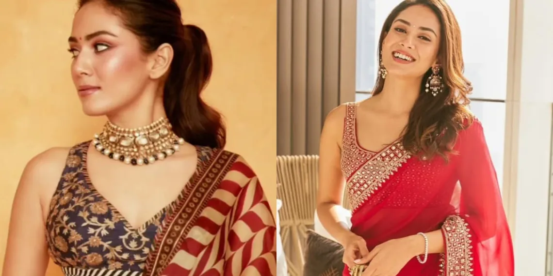 Demonstrating her innate ability to blend traditional and modern aesthetics, Mira’s red and beige saree is a testament to her fashion-forward approach. The lightweight saree features a mesmerizing interplay of burnt red and warm beige prints, anchored by a traditional deep red border. The blouse – a true masterpiece – combines a royal blue floral bodice with a bold zebra pattern, challenging conventional ethnic wear narratives and creating a look that is both unexpected and utterly captivating.