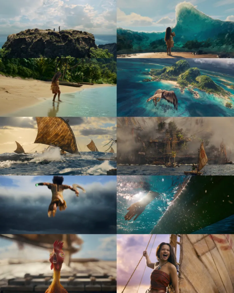 The teaser takes a different approach from typical action-packed trailers. Instead, it weaves shots of Moana running her hand through the ocean and exploring the scenery of the Pacific Islands as she sings “I Am Moana”. This artistic choice emphasizes the emotional and spiritual connection between Moana and the ocean that defines her character.