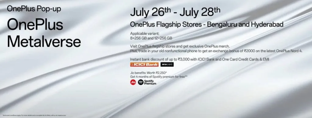 The OnePlus Metalverse events will take place from July 26th to 28th, 2024, from 11 am to 9 pm. In Bengaluru, the event will be held at the OnePlus Boulevard, while in Hyderabad, it will be hosted at the OnePlus Nizam Palace. These pop-up events promise an exciting and immersive experience for all attendees, celebrating the launch of the OnePlus Nord 4 with a blend of technology, entertainment, and exclusive offers.