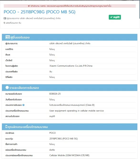 The POCO M8 5G has surfaced on Thailand’s NBTC certification database with model number 25118PC98G, signaling an imminent launch. Following multiple certifications across Singapore’s IMDA, EEC, and India’s BIS, the budget 5G smartphone appears ready for a global rollout in coming weeks.