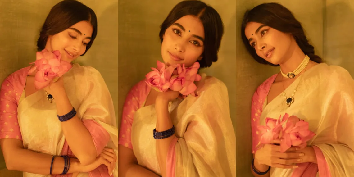 At the heart of Pooja Hegde show-stopping look is an ivory silk saree that serves as the perfect canvas for this vintage-inspired masterpiece. The choice of silk isn’t just about luxury; it’s a nod to the fabrics that have draped Indian women for centuries, capturing light and movement in a way that’s almost magical. The saree’s base color of ivory provides a neutral backdrop that allows the lotus-pink accents to truly pop, creating a visual harmony that’s both soothing and striking.