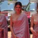 In a bold styling move that elevates the entire look from beautiful to unforgettable, Pooja’s accessories introduce a striking royal blue contrast to the ivory and pink palette of her saree. This unexpected color combination is a masterclass in how to use contrasting hues to create visual interest and depth.