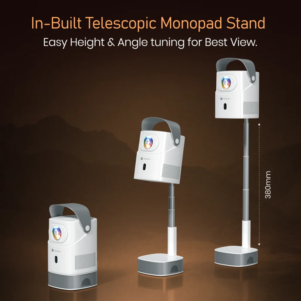 The Beem 550’s standout feature is its auto focus and auto keystone correction—simply power it on, and the projector adjusts itself for a perfectly aligned picture. No manual tweaking required. The in-built telescopic monopod stand adds flexibility, letting you adjust height and angle effortlessly.