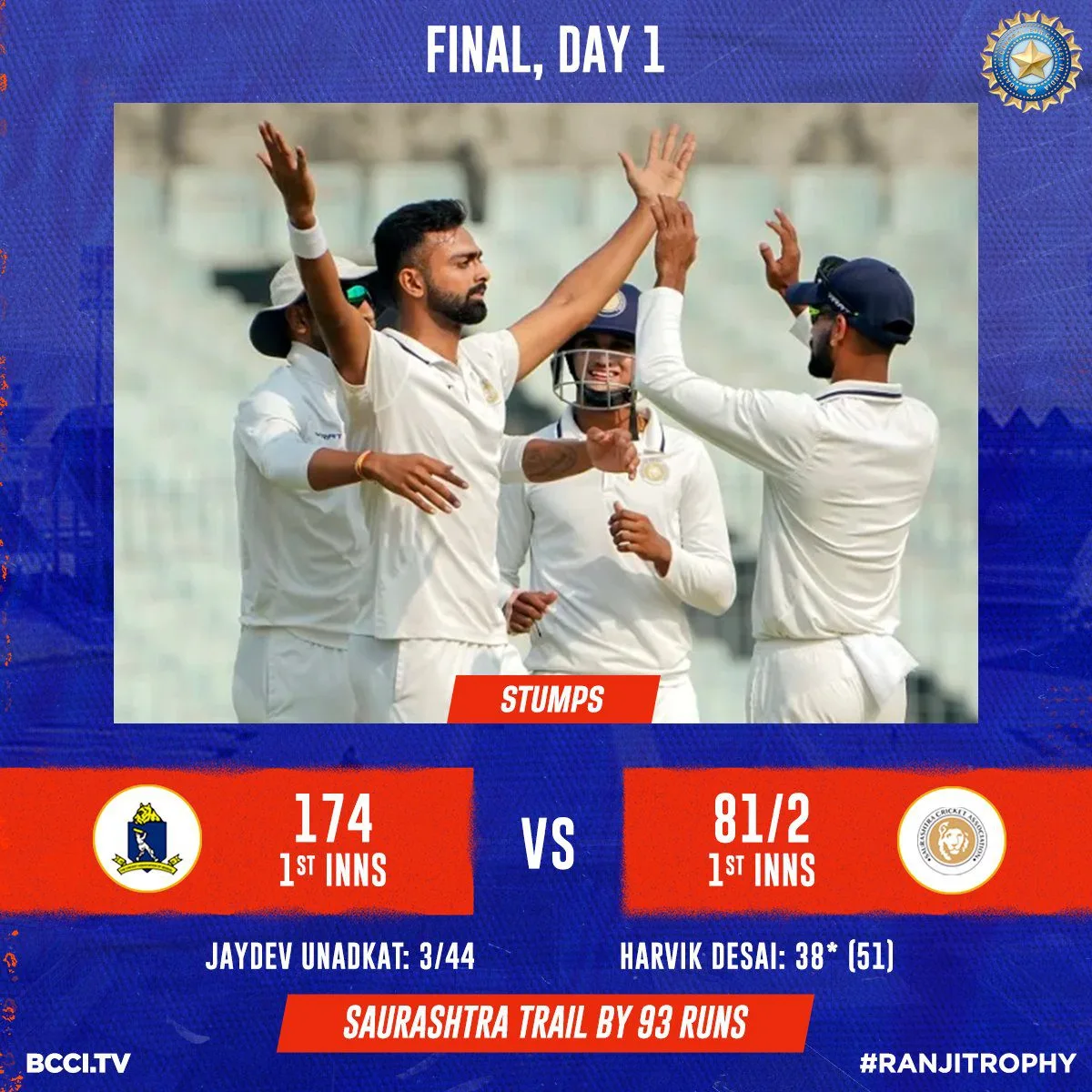 On the other hand, Chetan Sakariya supported Unadkat by taking three wickets, leaving Bengal reeling at 17/4 inside five overs. The visitors ended Day 1 on 81/2, with Saurashtra’s Vishvaraj Jadeja (40*) and Arpit Vasavada (31*) at the crease.