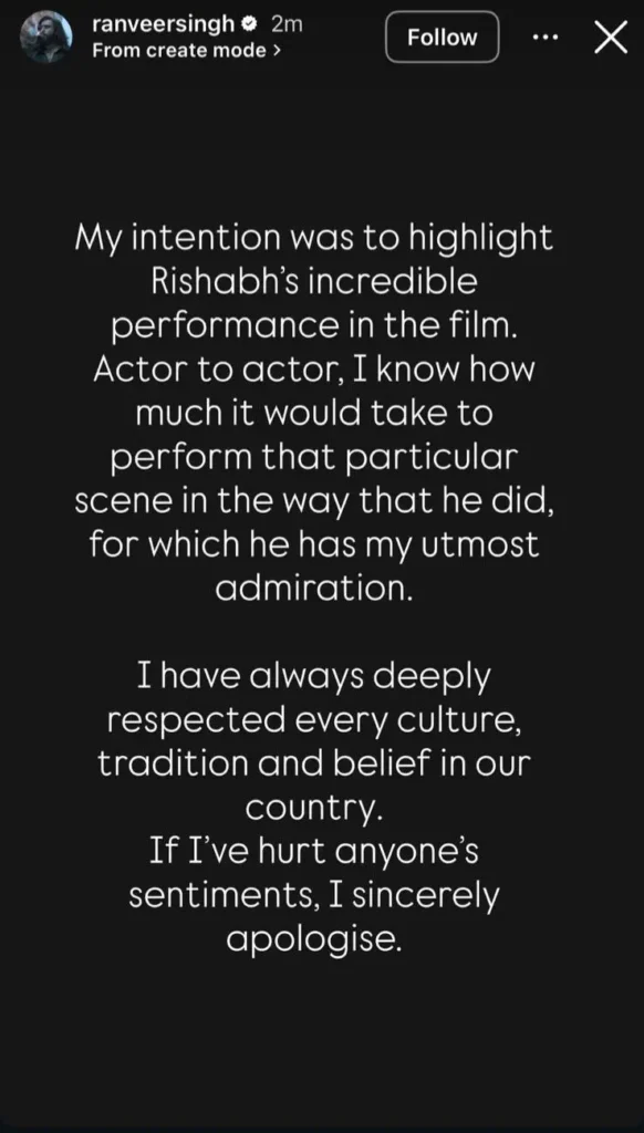 Ranveer issued an apology on Instagram stating his intention was to highlight Rishab’s performance and that he has “always deeply respected every culture, tradition and belief” in India. He sincerely apologized to anyone whose sentiments were hurt by his actions.
