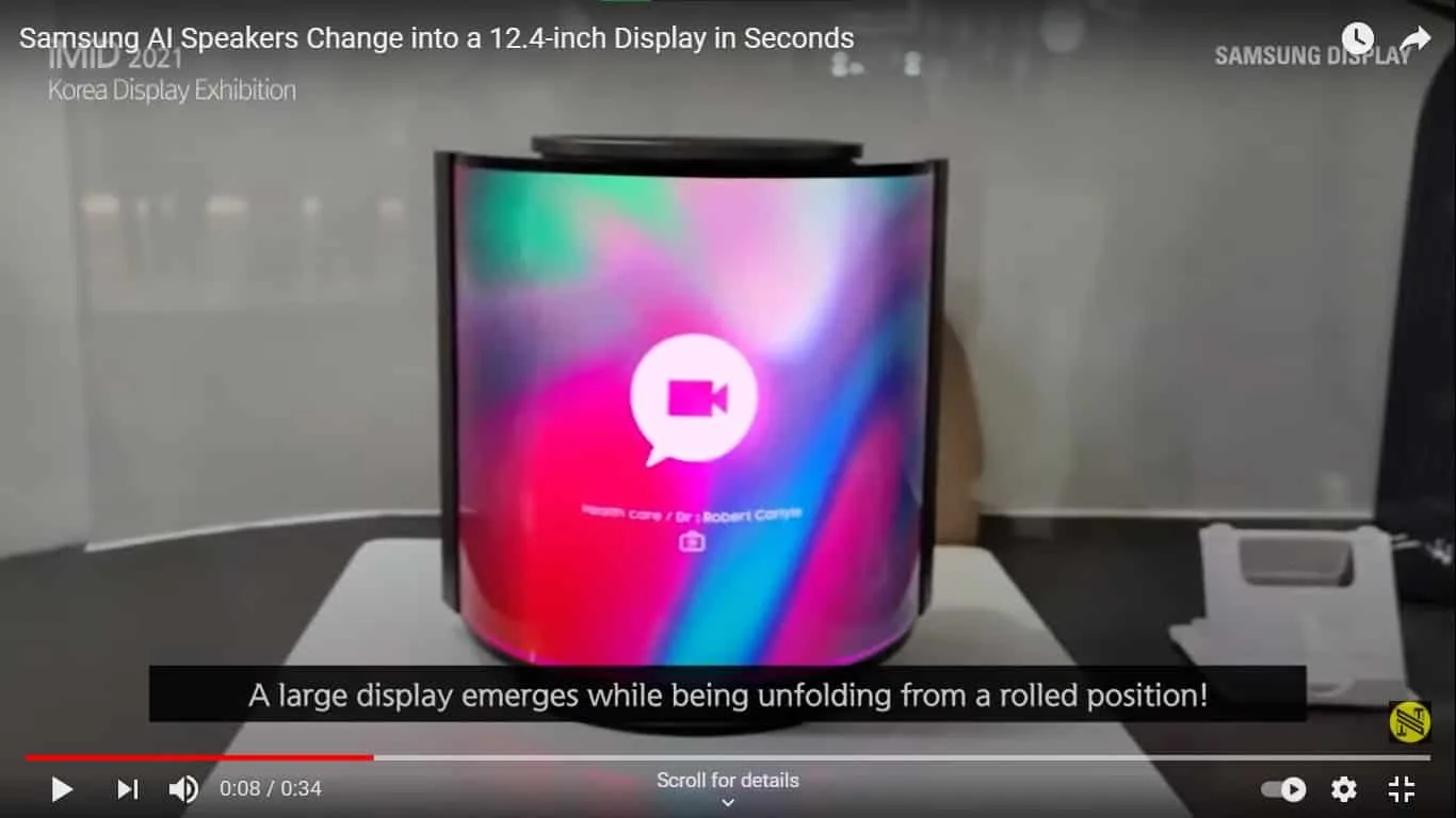 As per the video from the Korean display exhibition, the new smart speaker has a cylindrical body with a 12.4 inch OLED screen wrapped around it. Moreover, a single tap on the proprietary app helps in converting the AI speaker into a large 12.4-inch panel. The changing of the matrix happens smoothly in a matter of seconds.