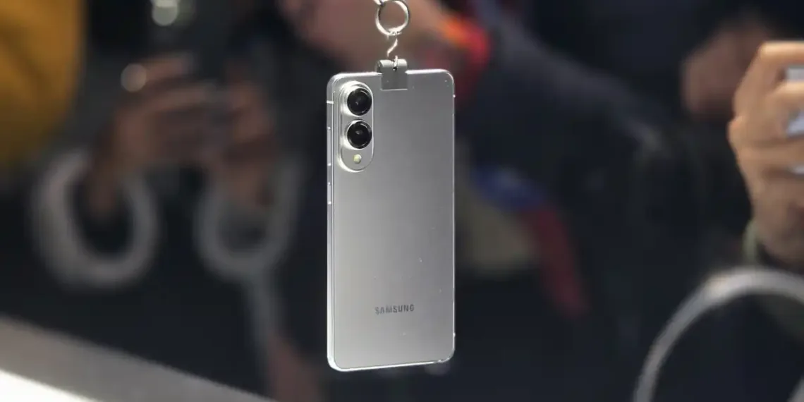 Even though Samsung wouldn’t let everyone touch the device, the demo unit was hanging in mid-air revealing how lightweight and thin the phone is. The back features dual rear cameras with an LED flash in an oval-shaped arrangement, while the power and volume buttons are located on the right side. The device appeared in a silver/grey color with a boxy frame and rounded edges. Rumors suggest the thickness of the phone will be around 6.4mm, which is slimmer compared to the 7.2mm thickness of the regular Galaxy S25 and 7.6mm for the Galaxy S24.