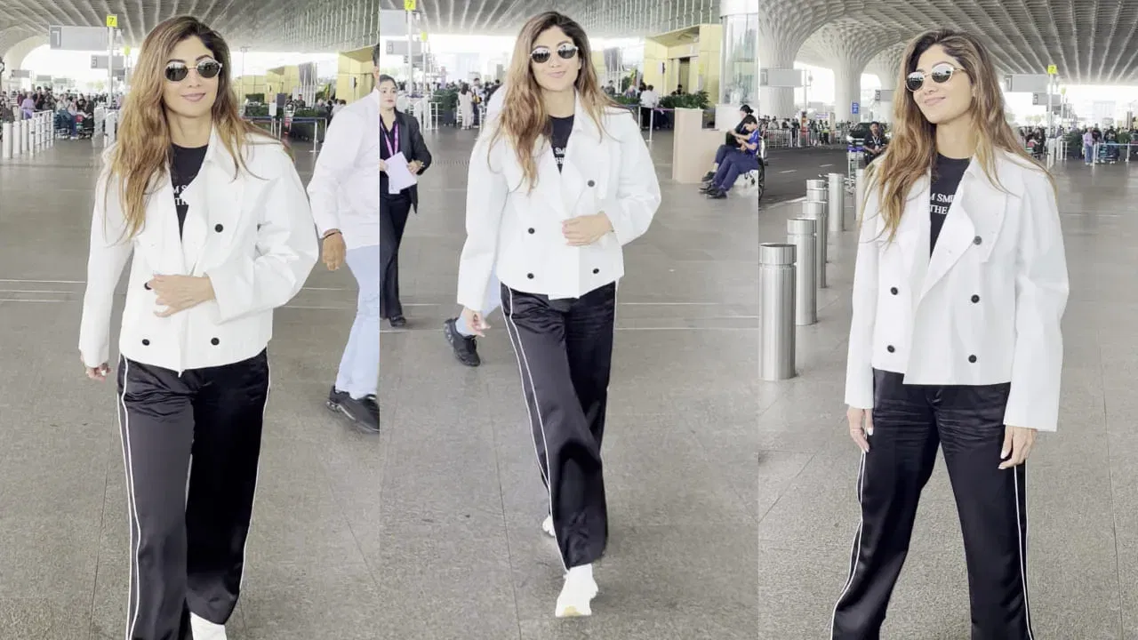 Shilpa Shetty Kundra’s airport outfit is a study in contrasts, blending the relaxed silhouette of track pants with the edgy appeal of a biker jacket. The track pants, crafted from a soft, breathable fabric, offer maximum comfort for travel, allowing for ease of movement whether you’re navigating security lines or settling in for a long-haul flight. The neutral color palette keeps the look understated, while subtle details like side stripes or a tailored fit add a touch of sophistication.