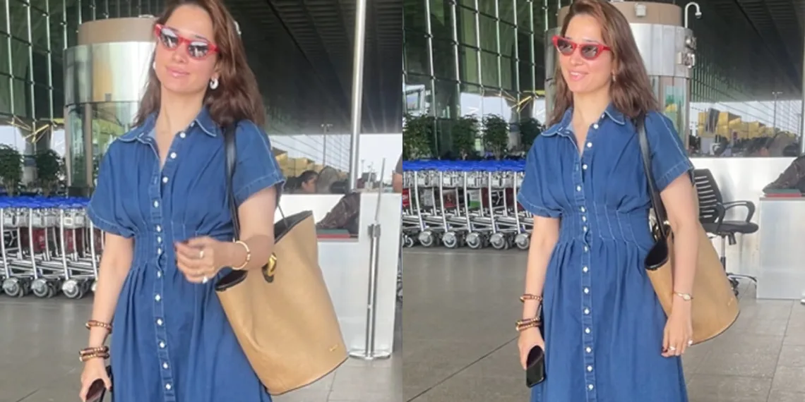 Tamannaah’s chosen piece is a masterclass in versatile design. A collared denim maxi dress that seamlessly transitions from airport travel to casual outings, it embodies the essence of modern, sustainable fashion. The dress features: