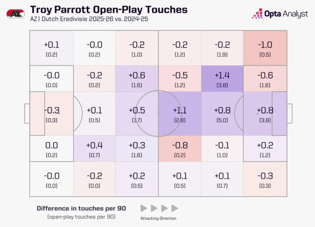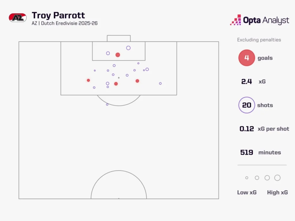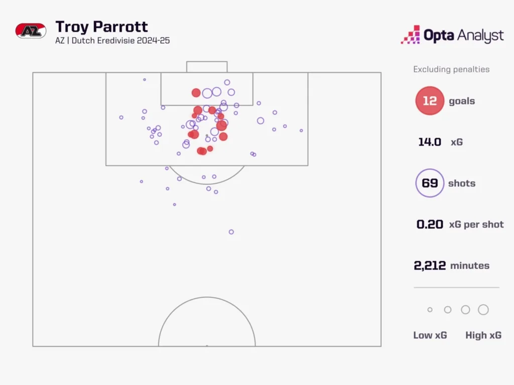 His development at AZ centers on intelligent movement and positioning rather than exceptional athleticism or technical wizardry. Troy Parrott’s non-penalty expected goals (xG) total of 14.0 was bettered by only one Eredivisie player last season, demonstrating his consistent ability to access high-quality scoring opportunities.