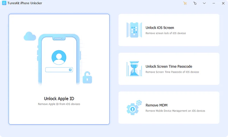 First, install and launch TunesKit iPhone Unlocker, then choose “Unlock iOS Screen”, “Unlock Apple ID”, “Unlock Screen Time Passcode” or “Remove MDM”. Connect your locked iPhone to the computer.