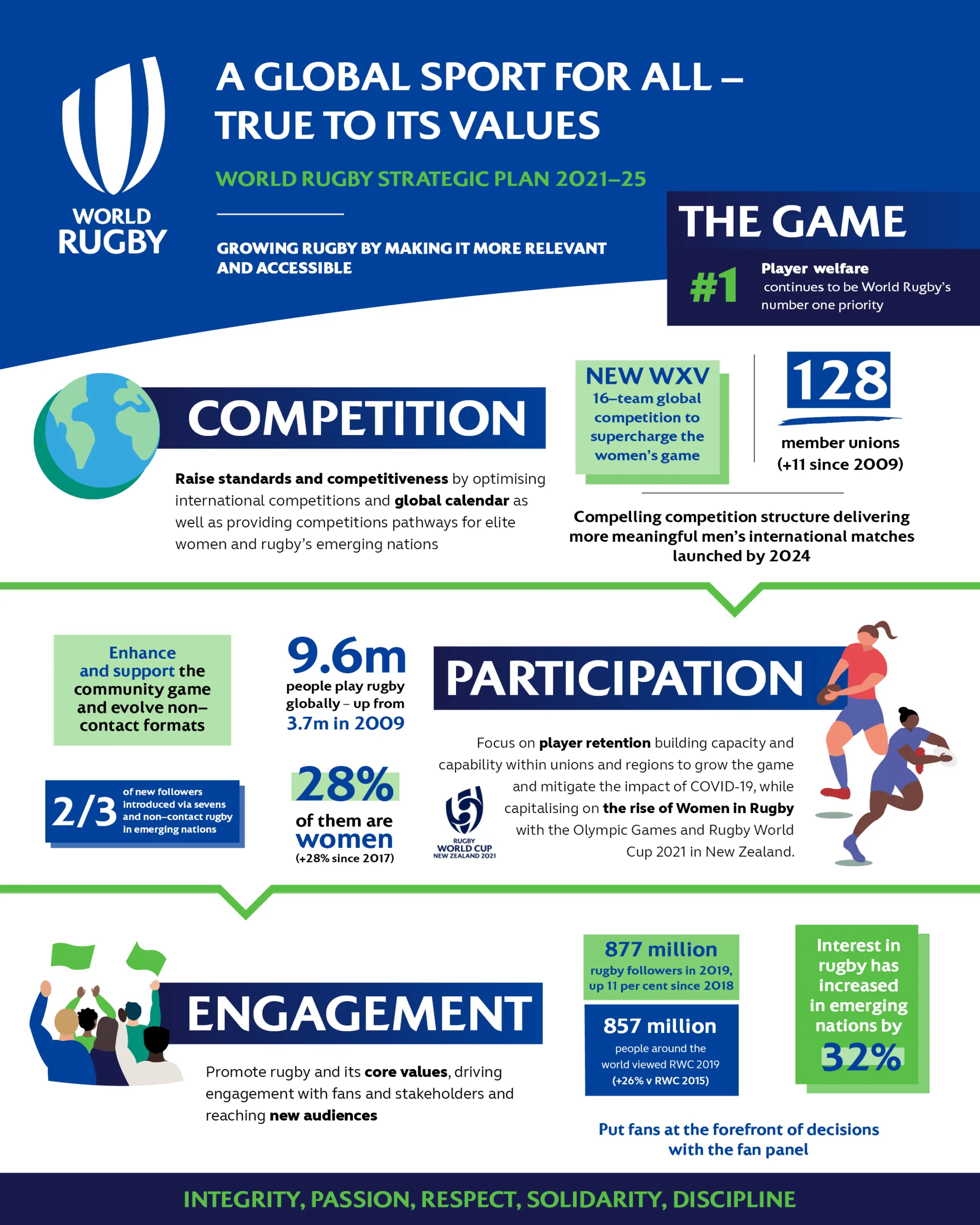“This is not just a plan for World Rugby, it is a plan for the whole rugby family that has embraced input from across the rugby community, from unions and regions to partners and stakeholders. Everyone has a role to play, whether they be a player, parent, fan, volunteer, coach or administrator, and we look forward to driving the sport forward together.”